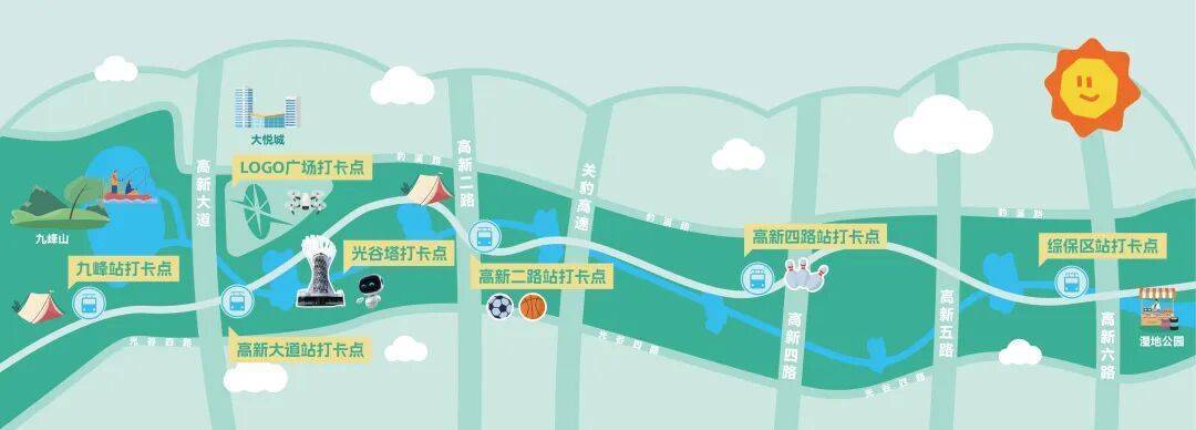 LOGO 广场(「空轨-高新大道站」以东200米):绝对是 “快乐中心”!科技与生态的双市集:科技体验市集能玩无人机足球赛、AI素描机器人3D打印、象棋机器人等,休闲生活市集有空轨文创、轻食软饮等,逛吃玩一站式搞定;旁边的主舞台上,乐队轮番开唱,还有亲子超爱的科学实验秀、大型魔术秀,互动感拉满;超大“天地双轨”主题花车,诠释光谷“空轨穿廊·生态嵌城”的科创共生理念;